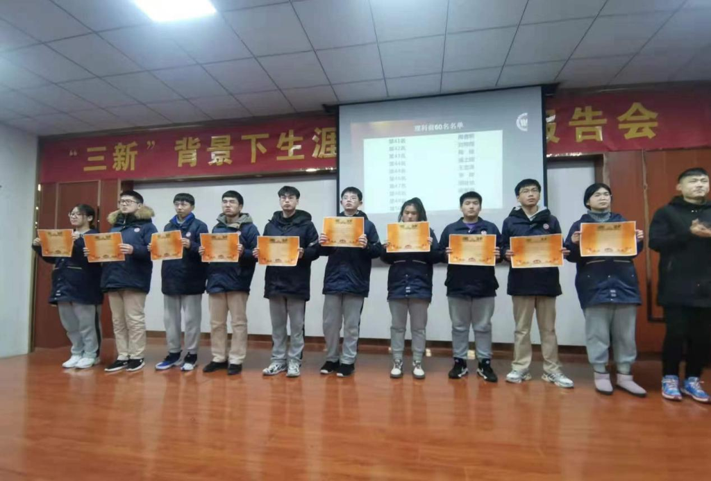 “皖南八?!甭摽紕倓偨Y束,淮南“一模”考試又即將到來,為了表彰先進,鼓舞斗志,我校高三年級組于2022年1月5日晚在階梯教室舉行了“皖南八?!甭摽急碚敏呋茨稀耙荒!眲訂T大會。楊成禮校長及部分領導和老師出席會議。