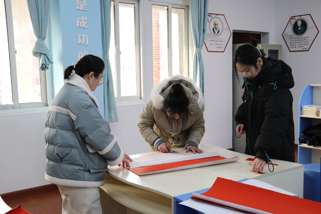 活動(dòng)現(xiàn)場(chǎng)呈現(xiàn)出一派歡樂(lè)祥和的氣氛,聞?dòng)嵹s來(lái)的教師和其他工作人員互相談?wù)撝鞲贝郝?lián)的寓意,熱鬧非凡。紅紅的春聯(lián)和張張的笑臉將活動(dòng)現(xiàn)場(chǎng)烘托得格外喜慶,教職工們捧著散發(fā)著墨香,飽含著濃濃年味和美好祝福的春聯(lián),個(gè)個(gè)喜笑顏開(kāi)。在書(shū)寫(xiě)春聯(lián)的同時(shí),閆玉良書(shū)記為大家講授著書(shū)法的技巧。
